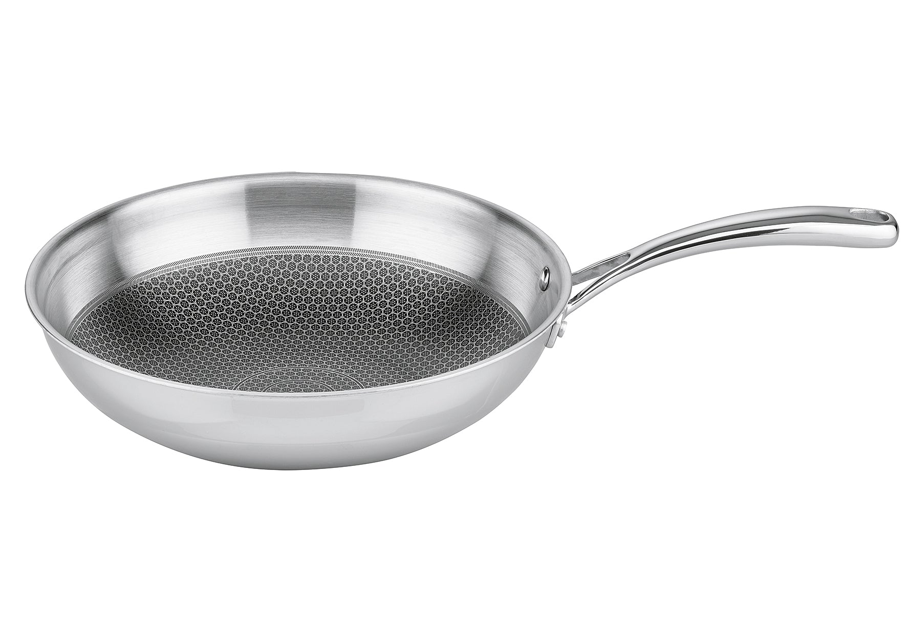 Edelstahl, durchgehender Aluminium-Kern, magnetischer Edelstahl, Materialstärke 2,5 mm, hochglanzpoliert, Wabenboden, kratzfest, gleichmäßige Wärmeverteilung, Öl-Dosiersystem für fettarme bis fettfreie Zubereitung, backofenfest bis 240 °C, für alle Herdarten inkl. Induktion geeignet Ø 30 cm, H 8 cm